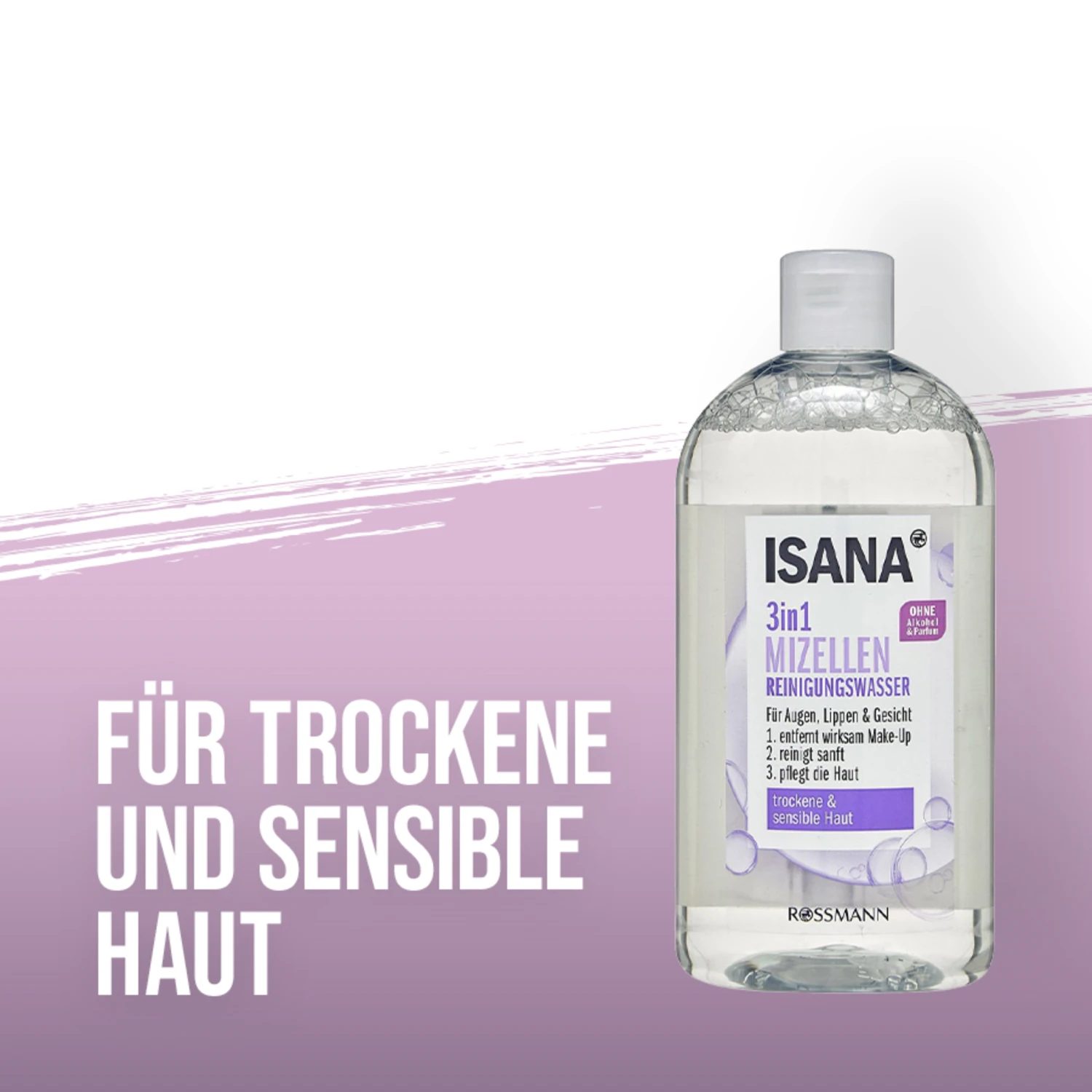 Morgens und Abends ein Wattepad mit ISANA 3in1 Mizellen Reinigungswasser tränken und sanft über Augen, Lippen und Gesicht streichen.