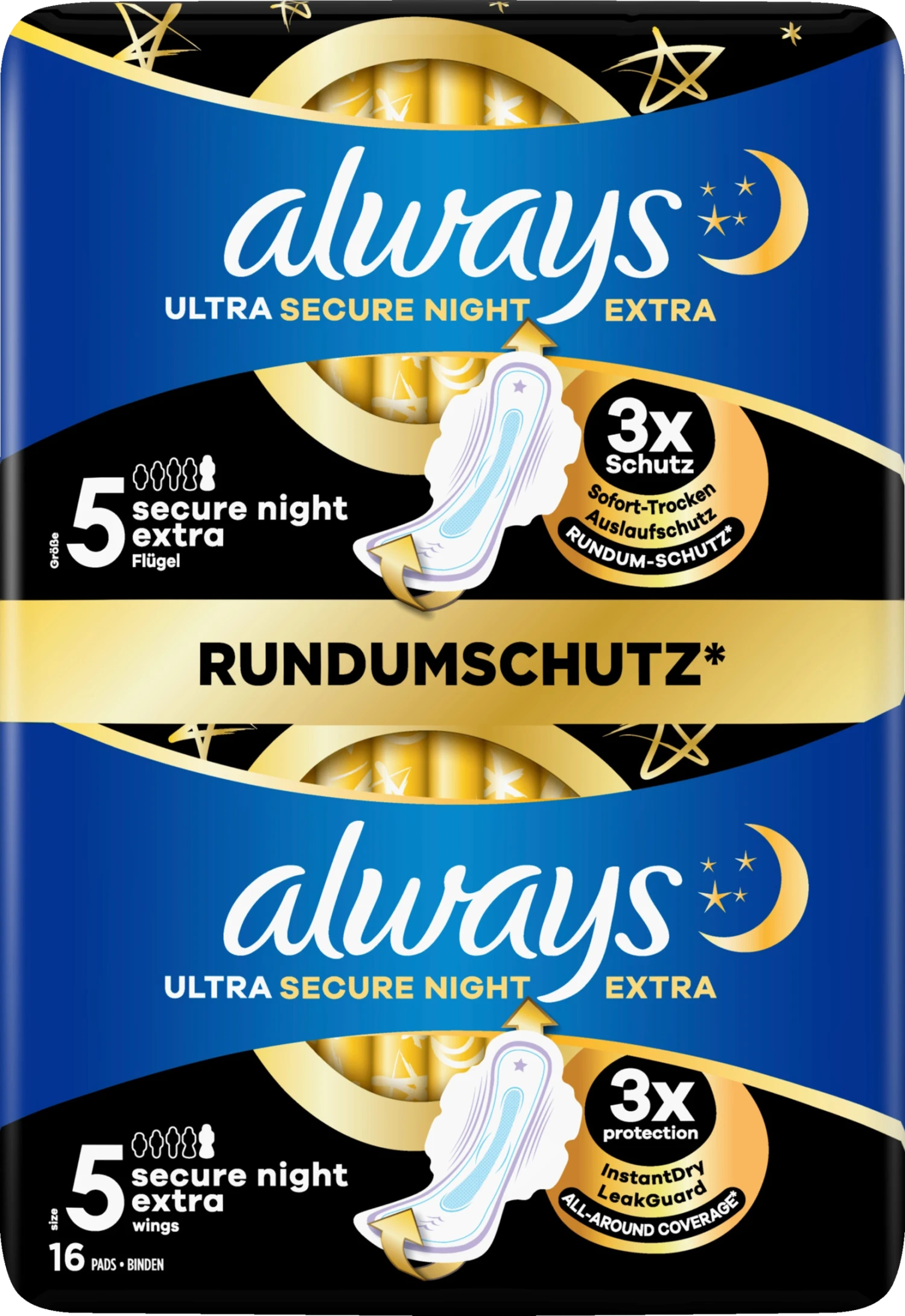 Geben Sie sich mit nicht weniger als 3-fachem Schutz für einen erholsamen Schlaf zufrieden: ALWAYS Ultra Secure Night Extra (Größe 5) Damenbinden mit Flügeln sind mit 3 Schutzfunktionen ausgestattet, damit Sie nicht aufwachen, um den Schutz Ihrer Binde zu überprüfen oder um Ihre Binde mitten in der Nacht wechseln zu müssen. Eine 9 % größere Vorderseite und eine 85 % größere Rückseite (im Vergleich zu Always Ultra Normal) und die LeakGuard-Technologie sorgen für einen Rundum-Schutz, um das Auslaufen auch während der Nacht zu vermeiden. Das InstantDry-System absorbiert Flüssigkeit in Sekunden und hält Feuchtigkeit von der Haut fern. Die OdourLock-Technologie neutralisiert Gerüche, sodass Sie sich während Ihrer Periode frisch und sauber fühlen. Schlafen Sie gut, denn ALWAYS Ultra schützt Sie jetzt 3-fach. Dermatologisch von der Skin Health Alliance bestätigt. Mit Always My Fit finden Sie die richtige Passform für Ihre Bedürfnisse. So erhalten Sie den besten Schutz von ALWAYS während der Periode, passend zu Ihrer individuellen Figur und Periodenstärke.