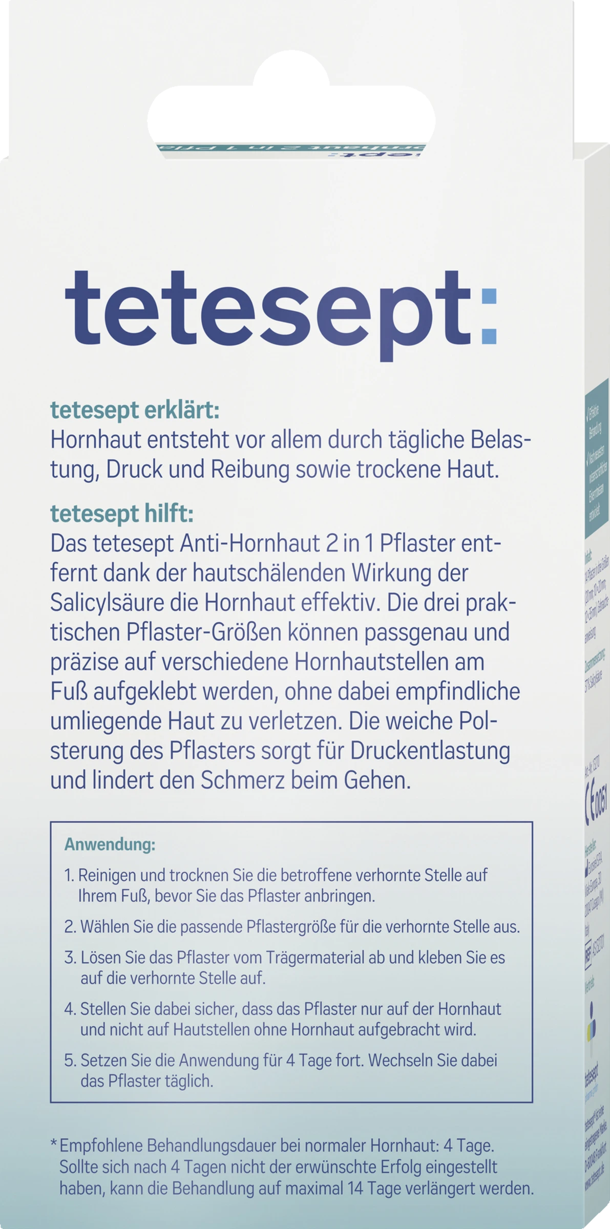 Das tetesept Anti-Hornhaut 2in1 Pflaster entfernt dank der hautschälenden Wirkung der Salicylsäure die Hornhaut effektiv. Die drei praktischen Pflaster-Größen können passgenau und präzise auf verschiedene Hornhautstellen amFuß aufgeklebt werden, ohne dabei empfindliche umliegende Haut zu verletzen. Die weiche Polsterung des Pflasters sorgt für Druckentlastung und lindert den Schmerz beim Gehen.