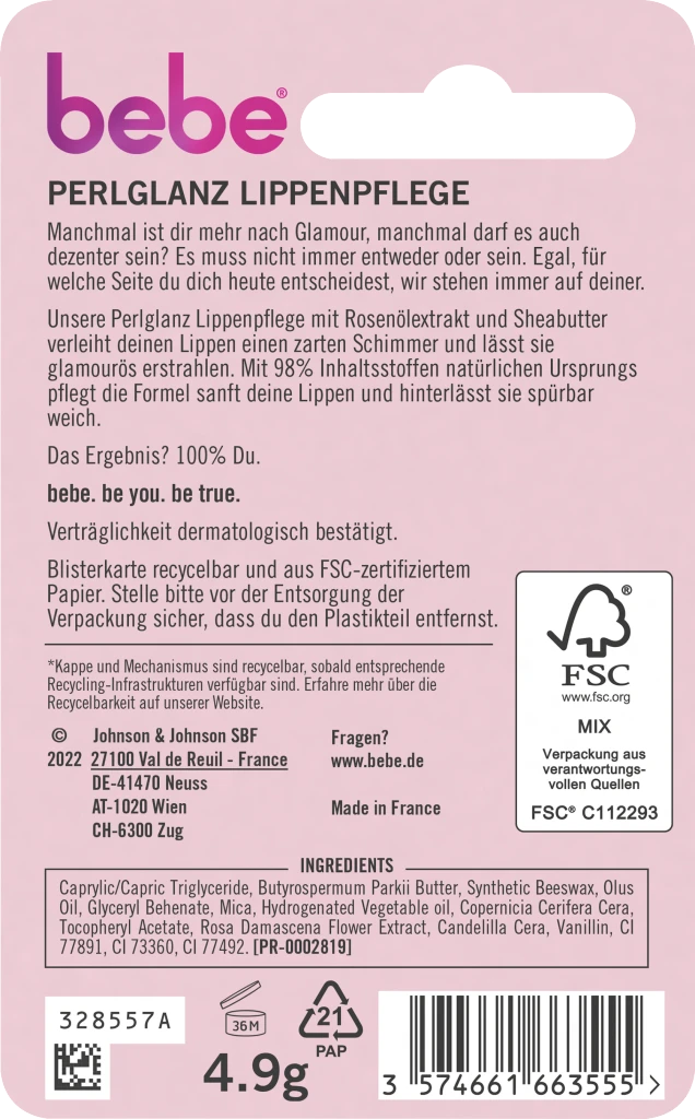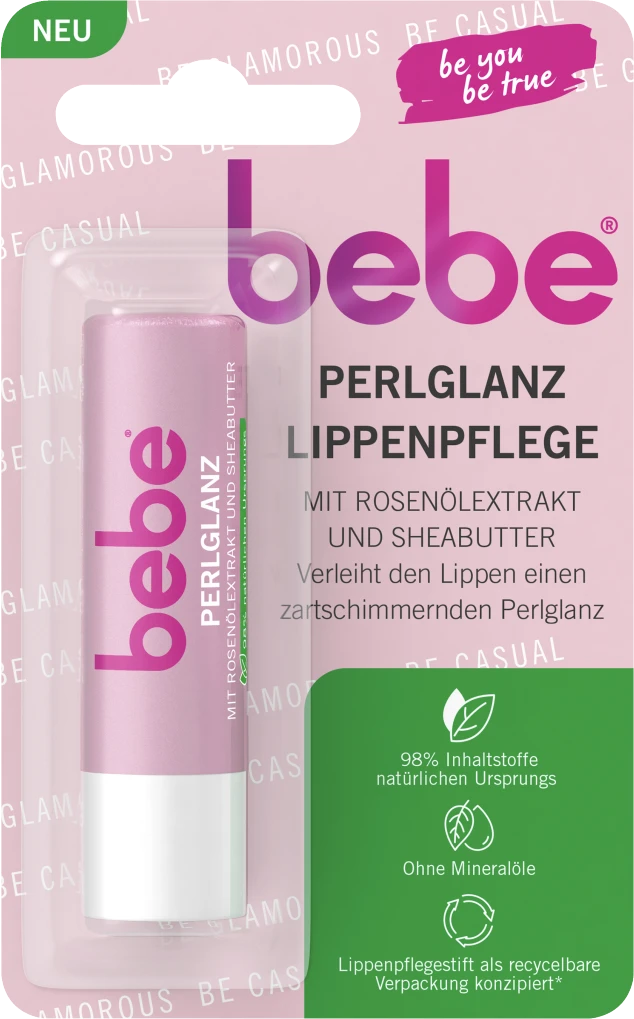 Die bebe Perlglanz Lippenpflege mit Rosenölextrakt und Sheabutter verleiht deinen Lippen einen zarten Schimmer und lässt sie glamourös erstrahlen. Mit 98% Inhaltsstoffen natürlichen Ursprungs pflegt die Formel sanft deine Lippen und hinterlässt sie spürbar weich. Verträglichkeit dermatologisch bestätigt.