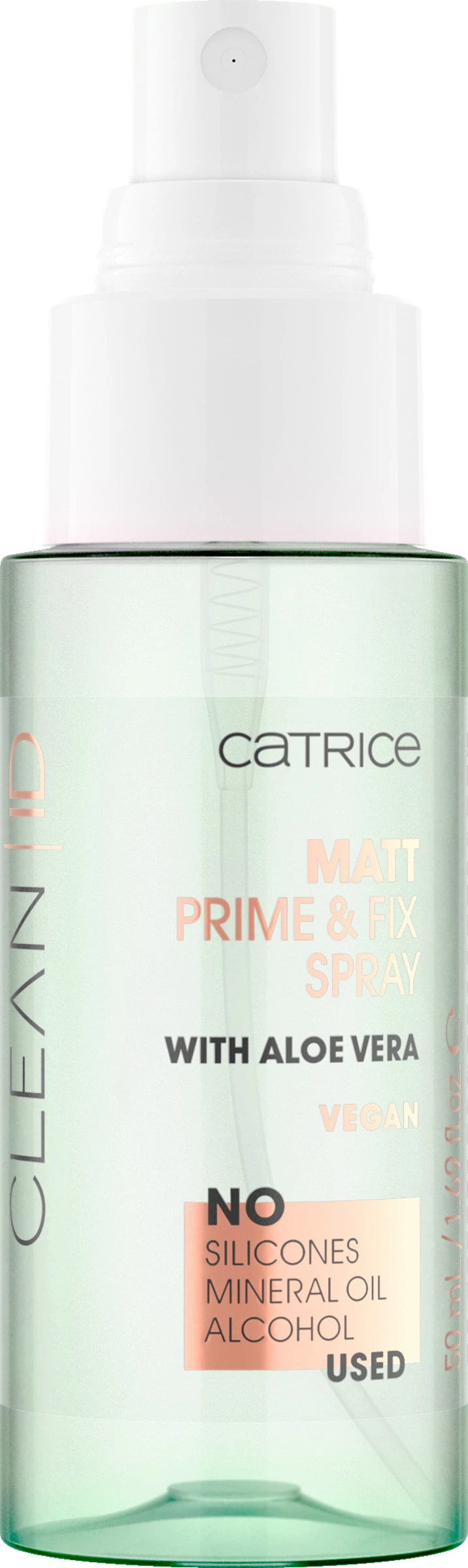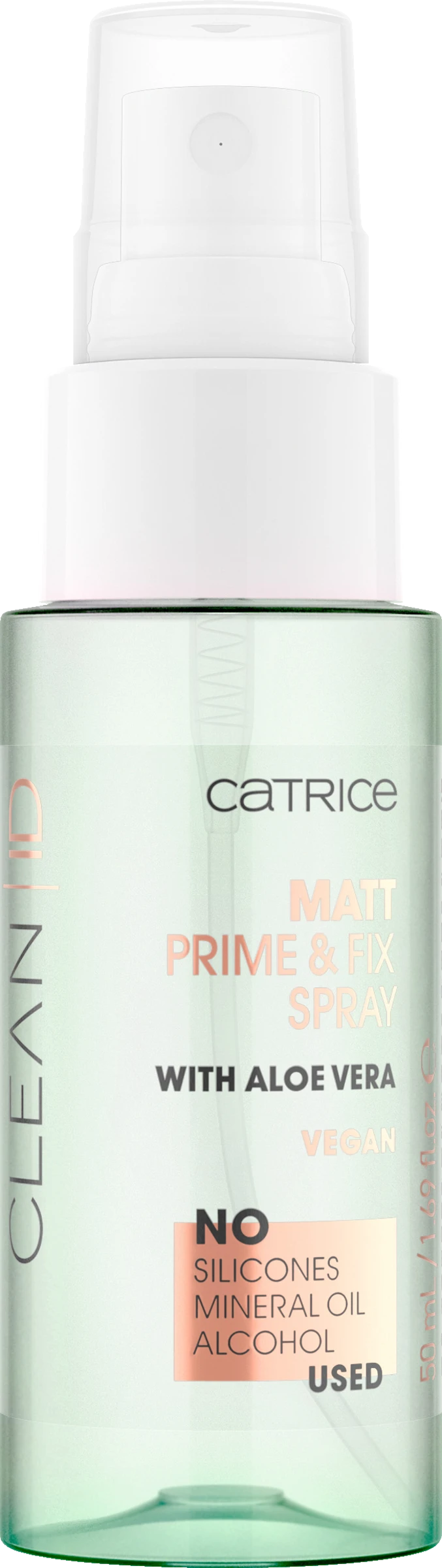 Das Clean ID Matt Prime & Fix Spray eignet sich als Grundierung unter der Foundation sowie zur Fixierung des Make-ups und sorgt so für einen langen Halt. Die Formel mit Aloe vera beruhigt die Haut und verleiht mit Evermat™ von Sederma ein mattierendes Finish. Die transparente Textur duftet außerdem angenehm frisch nach Aloe vera.