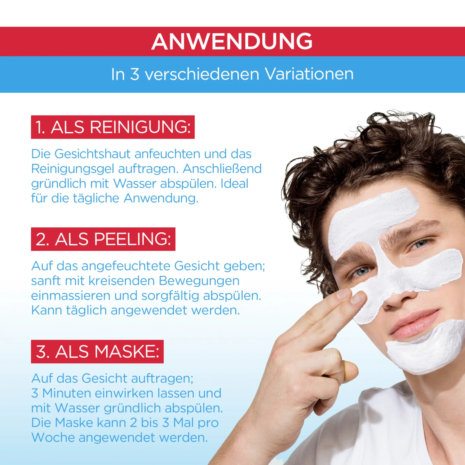 1. Reinigung: Auf das angefeuchtete Gesicht auftragen und gründlich abspülen. Täglich anwenden.
