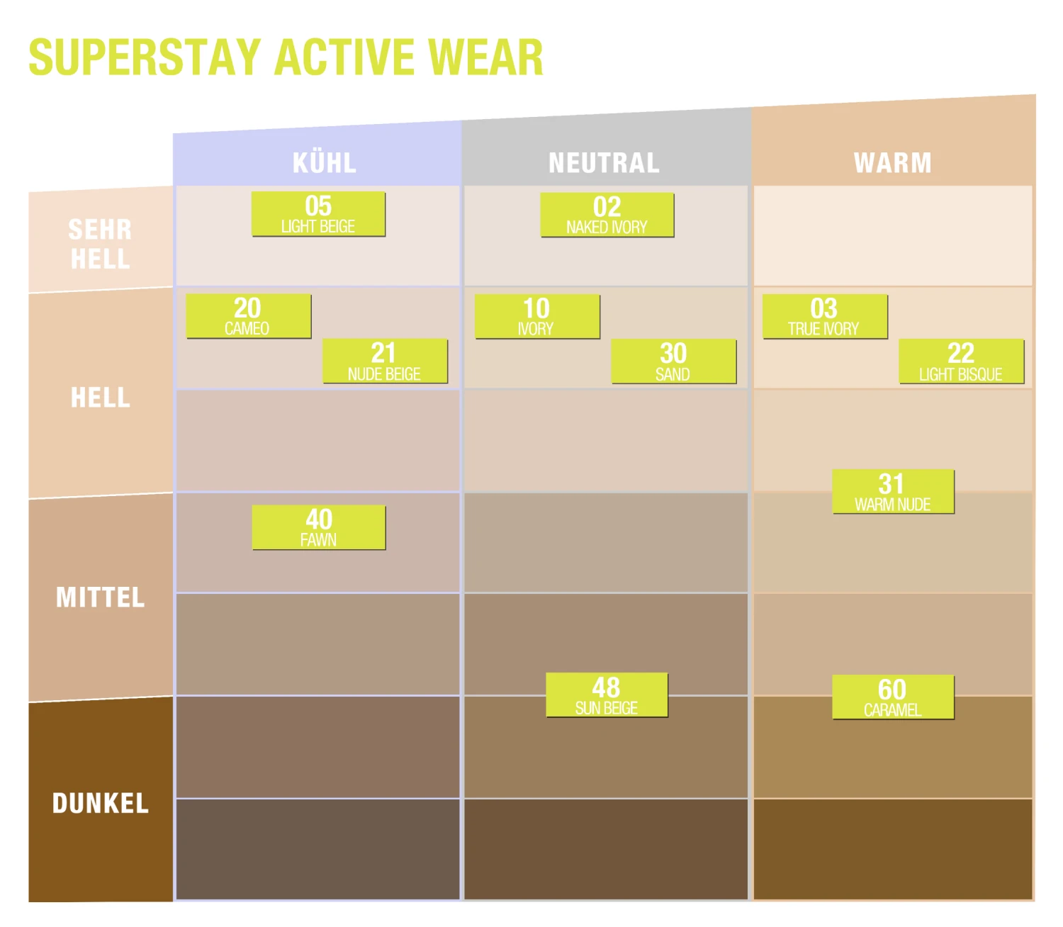 Langanhaltendes Make-up ohne Maskeneffekt – bis zu 30 Stunden? Das kann die neue Super Stay Active Wear Foundation von Maybelline New York, denn sie bietet mehr, als nur lange Haltbarkeit. Dank der innovativen Formel mit schwerelos wirkenden, intensiven Farbpigmenten und ihrer luftig-leichten Textur lässt sie die Haut atmen und bietet trotzdem eine hohe Deckkraft mit einem Halt für bis zu 30 Stunden. Durch ihr schwereloses Tragegefühl und ihr ebenmäßiges Finish fühlt sich die Foundation wie eine zweite Haut an. Für einen ebenmäßigen Teint mit einem soften, matten Finish. Die Super Stay Active Wear Foundation ist wasserfest, färbt nicht ab und hält somit verschiedenen Lebenssituation stand.
