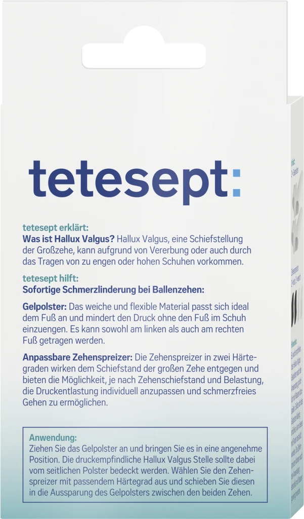 tetesept Hallux Valgus Gelpolster anziehen und in angenehme Position bringen. Die druckempfindliche Hallux Valgus Stelle sollte dabei vom seitlichen Polster bedeckt werden.