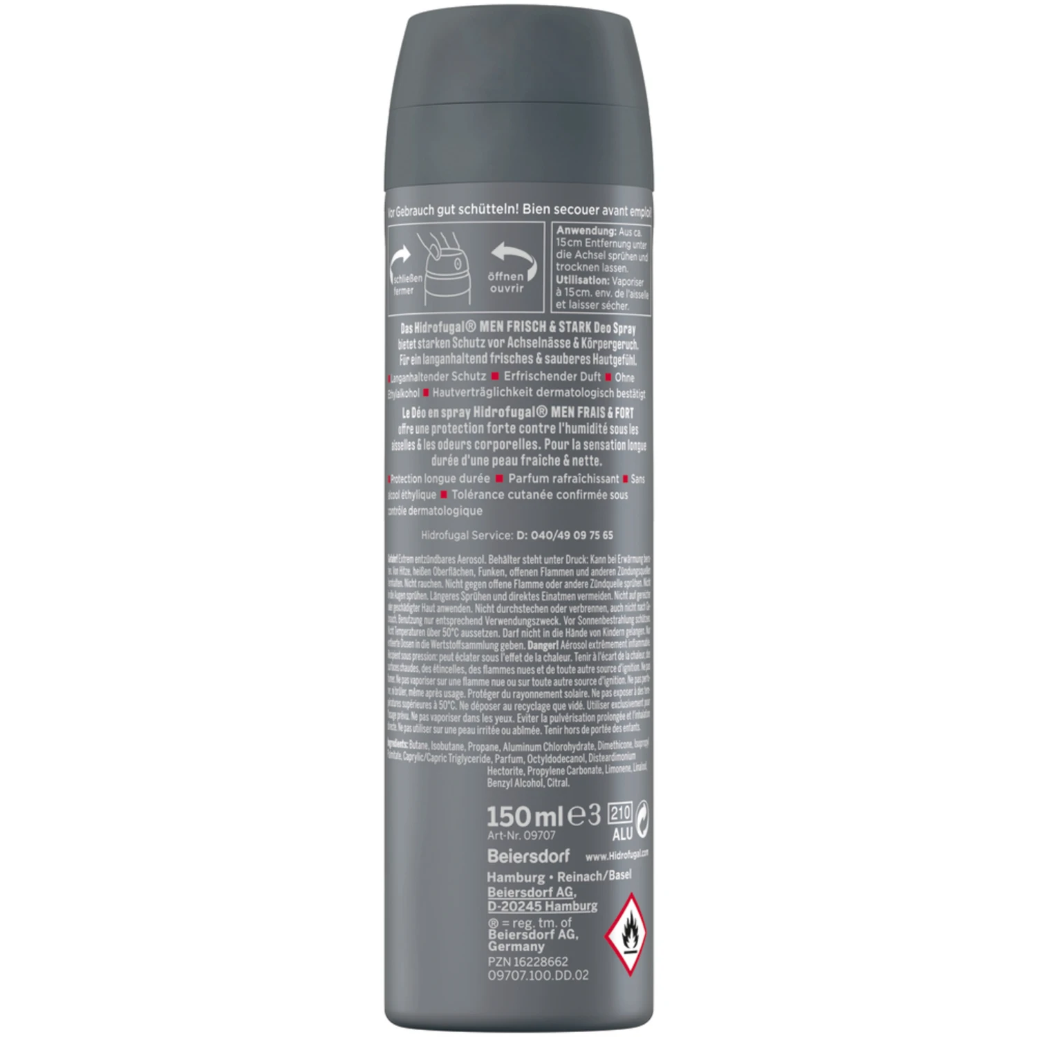 Extrem entzündbares Aerosol. Behälter steht unter Druck: Kann bei Erwärmung bersten. Von Hitze, heißen Oberflächen, Funken, offenen Flammen und anderen Zündungsquellen fernhalten. Nicht rauchen. Nicht gegen offene Flamme oder andere Zündquelle sprühen. Nicht in die Augen sprühen. Längeres Sprühen und direktes Einatmen vermeiden. Nicht auf gereizter oder geschädigter Haut anwenden. Nicht durchstechen oder verbrennen, auch nicht nach Gebrauch. Benutzung nur entsprechend Verwendungszweck. Vor Sonnenbestrahlung schützen. Nicht Temperaturen über 50°C aussetzen. Darf nicht in die Hände von Kindern gelangen. Nur entleerte Dosen in die Wertstoffsammlung geben.