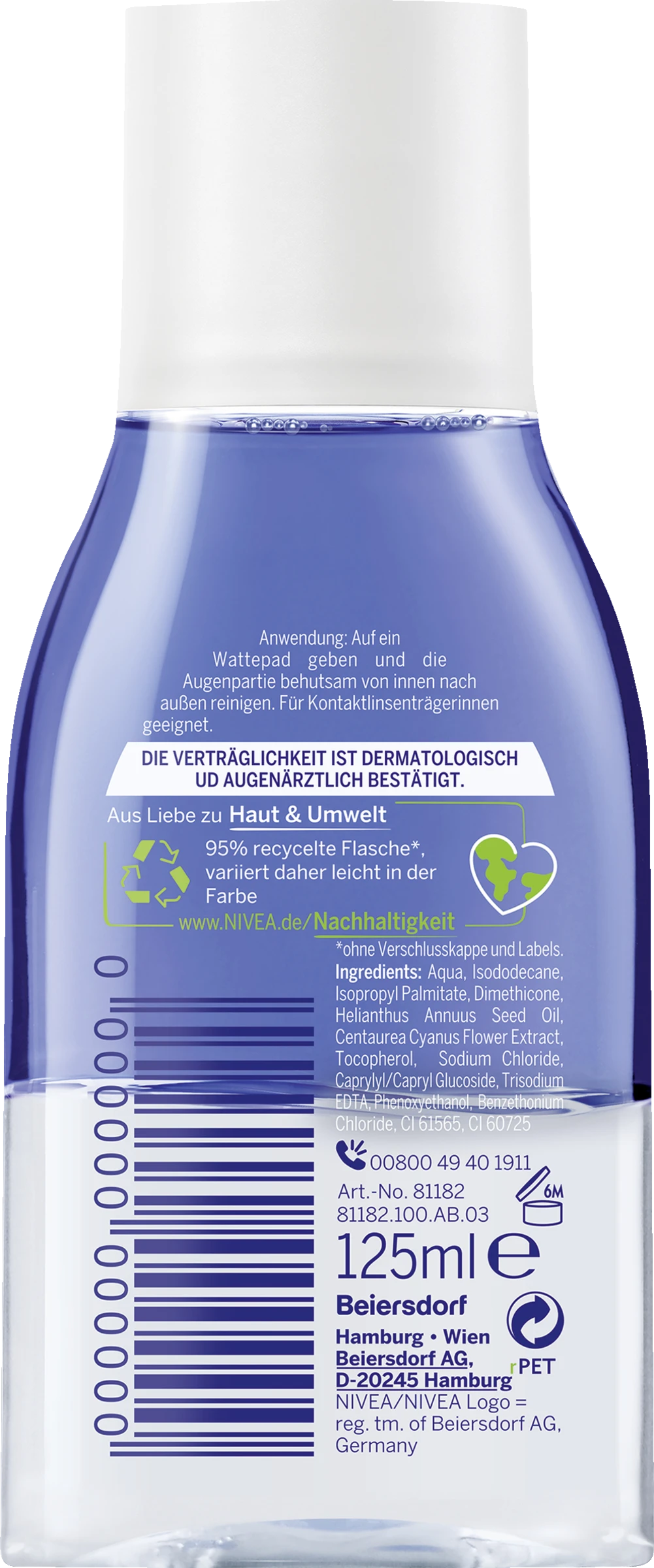Die sensible Augenpartie wird gründlich und zugleich sanft gereinigt. Die Wimpern werden gepflegt. Der Double Effect Augen Make-up Entferner ist mit Kornblumenextrakt angereichert und auch für Kontaktlinsenträgerinnen geeignet. Die Verträglichkeit ist dermatologisch und augenärztlich bestätigt.