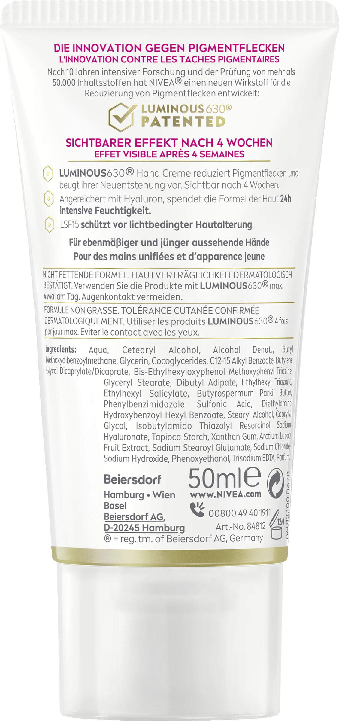 NIVEA LUMINOUS630 Hand Creme – DIE INNOVATION GEGEN PIGMENTFLECKEN. Nach 10 Jahren intensiver Forschung und der Prüfung von mehr als 50.000 Inhaltsstoffen hat NIVEA einen neuen Wirkstoff für die Reduzierung von Pigmentflecken entwickelt. Die LUMINOUS630 Hand Creme reduziert Pigmentflecken und beugt ihrer Neuenstehung vor. Angereichert mit Hyaluron, spendet die Formel der Haut 24h intensive Feuchtigkeit. Für ebenmäßiger und jünger aussehende Hände: LUMINOUS630 Hand Creme.