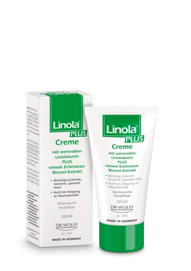 Linola PLUS Creme lässt sich sehr gut auf einzelnen, besonders betroffenen Hautstellen anwenden. Sie fördert die Regeneration der natürlichen Hautbarriere. Gleichzeitig beruhigt sie juckende und irritierte Haut. Linola PLUS Creme enthält wertvolle Linolsäuren sowie als „PLUS“ den reinen Wurzel-Extrakt der Echinacea purpurea (Pupur-Sonnenhut). Er wird mithilfe „Grüner Technologie“ unter Verwendung natürlicher Quellkohlensäure gewonnen. Die Verträglichkeit von Linola PLUs Creme wurde dermatologisch nachgewiesen. Sie kann auch bei Kindern jeden Alters angewendet werden. Medizinische Hautpflege.