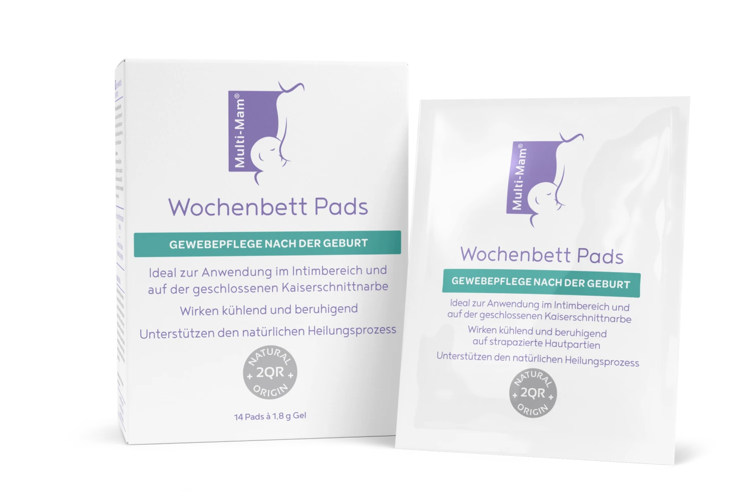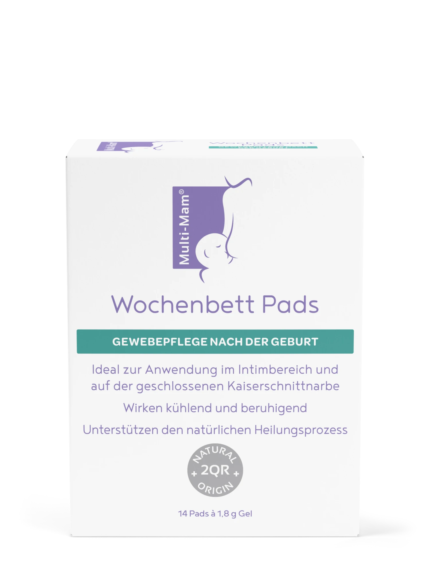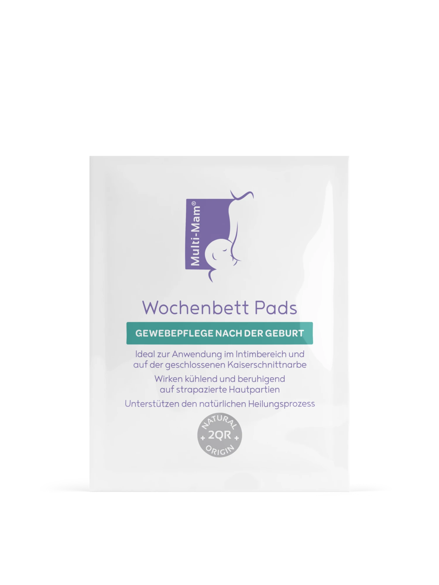 Multi-Mam Wochenbett Pads sind ideal zur äußerlichen Anwendung im Intimbereich auf Damm sowie im Analbereich bei Hämorrhoiden. Diese eignen sich auch ideal für die Narbenpflege nach einem Kaiserschnitt. Sie können die gebrauchsfertigen Pads auch auf die geschlossene Kaiserschnittnarbe legen, zur Kühlung und Beruhigung. Die Wochenbett Pads basierend auf natürlichen Inhaltsstoffen, enthalten den natürlichen patentierten 2QR-Komplex auf Aloe-Basis.